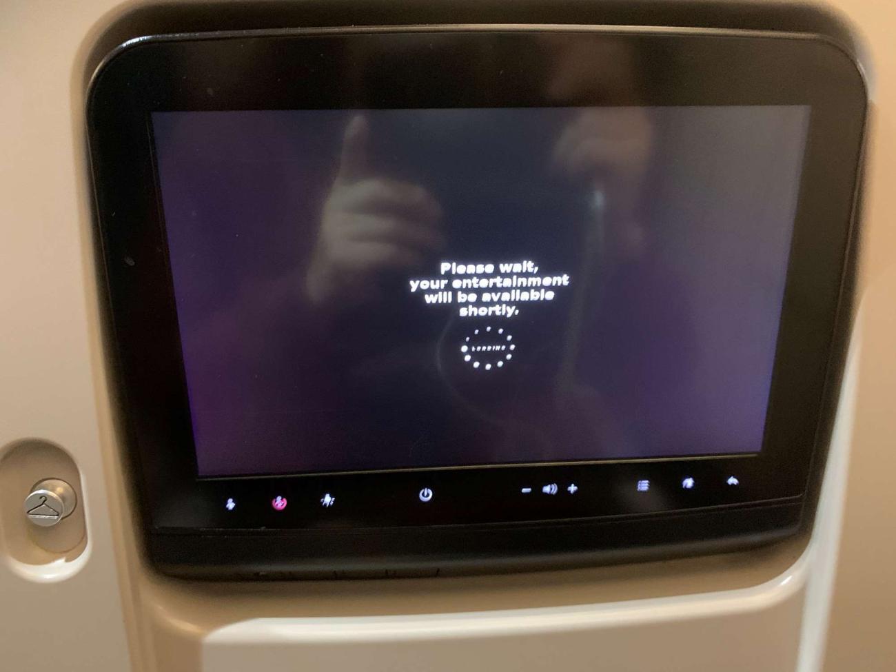 座席のモニターが動かいときは電源ボタンを長押ししてリセットすべし!